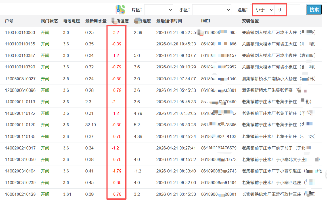 事件:临泉县“群众喝上引调水”工程遭遇持续强降雪及低温天气,气温持续低于“冰点”长达四天,最低预报温度达-9℃,晚间局部村镇更是达到-12℃。结果:区域内存量民用水表出现大面积冻损情况,而同期由我司完成安装并管理的15000余台智能水表(单桥镇1351台、老集镇1359台、滑集镇1116台、长官镇472台、关庙镇454台、吕寨镇611台、姜寨镇931台)等,仅冻坏3台,故障率不足万分之二。这一巨大反差,并非偶然,其背后是我司针对中纬度地区冰冻环境,从产品到安装、从硬件到软件的系统性、综合性防护解决方案在发挥作用。系统性解决方案,铸就“抗冻金身”